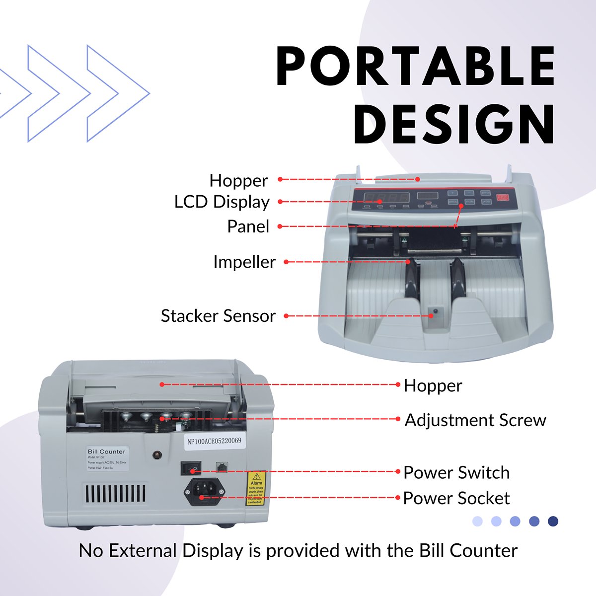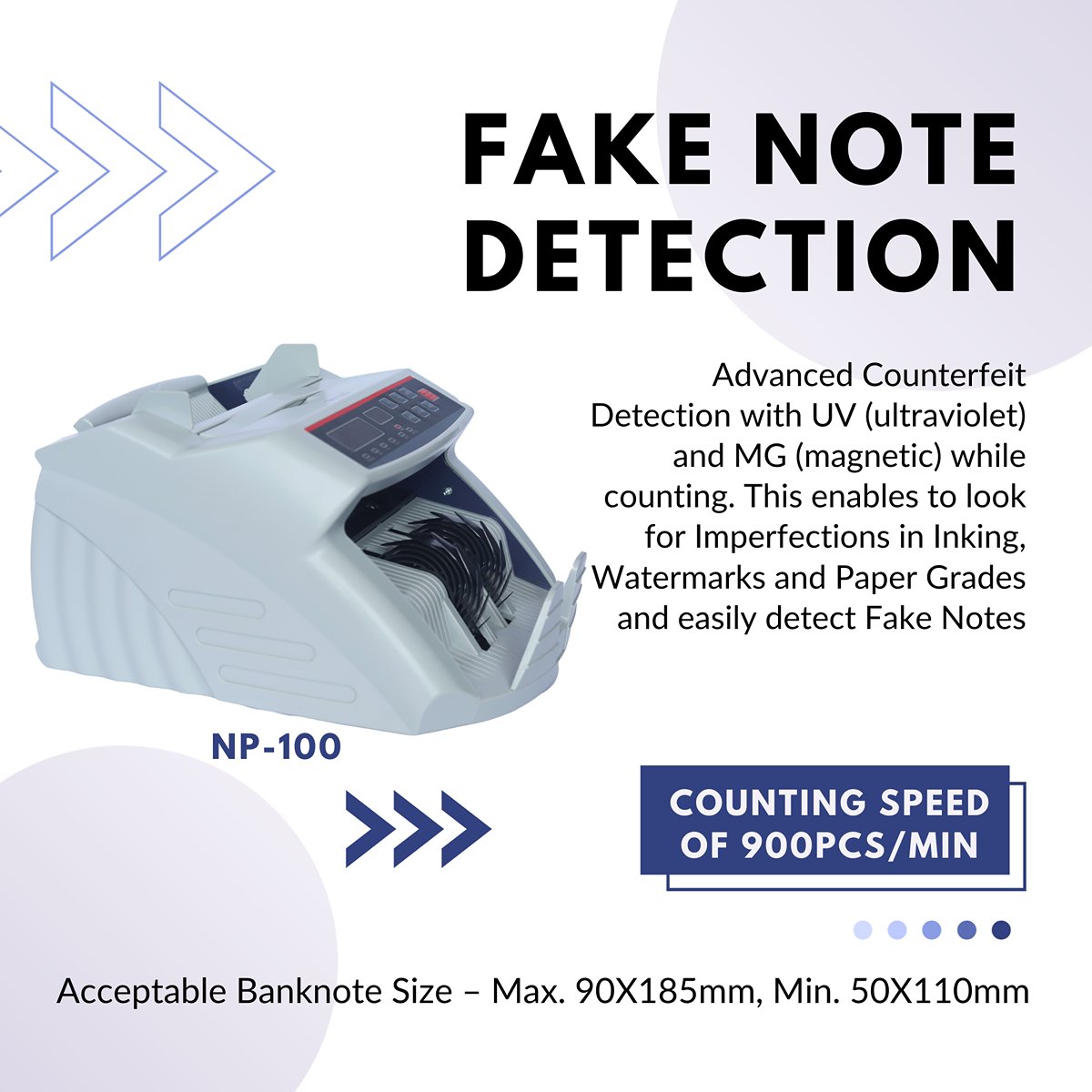 The NP Tech NP-100 Bill Counter is the epitome of efficiency and reliability in note counting. With advanced counterfeit detection using UV and MG sensors, it effortlessly identifies fake notes by scrutinizing inking, watermarks, and paper quality. Offering seamless automation, it starts, stops, and clears automatically, alongside handy functions like batching, adding, and self-examination. The vibrant LED display provides instant feedback, turning red when counterfeit notes are detected. Precision is paramount, with the NP-100 accurately counting INR 10, INR 20, INR 50, INR 100, INR 200, INR 500, and INR 2000 notes. Designed to handle notes of various sizes, this Bill Counter is a powerhouse with a counting speed of 900 pieces per minute. For businesses and individuals seeking excellence in note counting, the NP Tech NP-100 Bill Counter stands as the top choice.